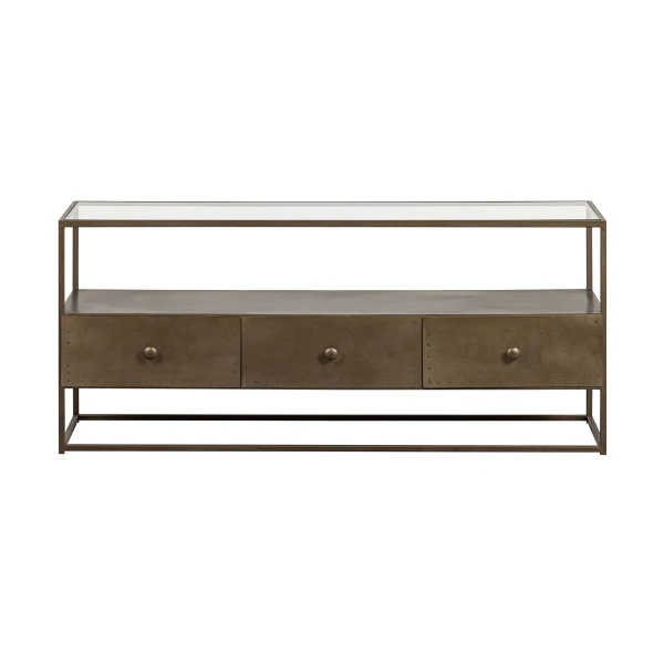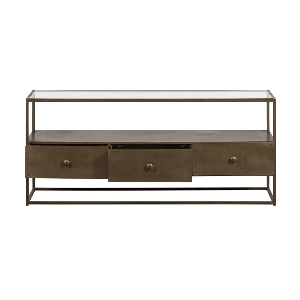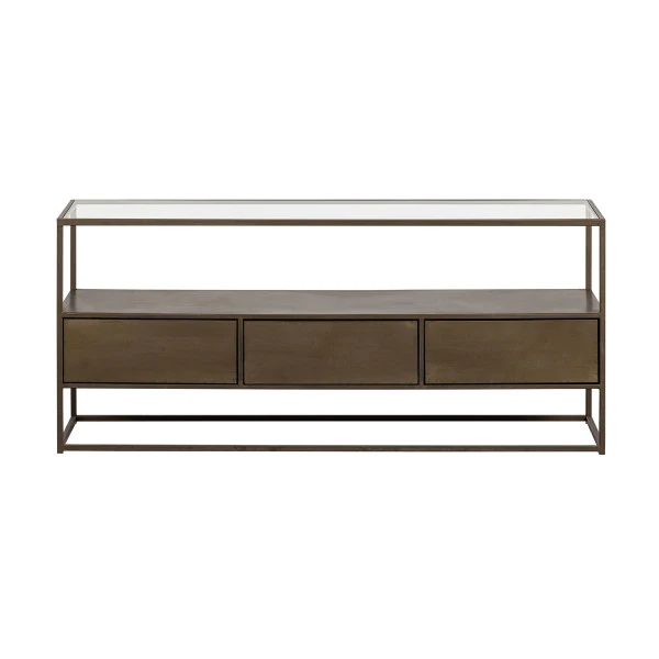 Het BePureHome Depart tv-meubel maakt indruk met haar gouden gloed. Het metaal is afgewerkt met een antique brass coating, die voor een warme vintage sfeer zorgt. De bovenste plank is gemaakt van glas. In het open vak is plaats voor je apparatuur of een mooie decoratie; opladers en afstandsbedieningen ruim je netjes weg in de drie lades.