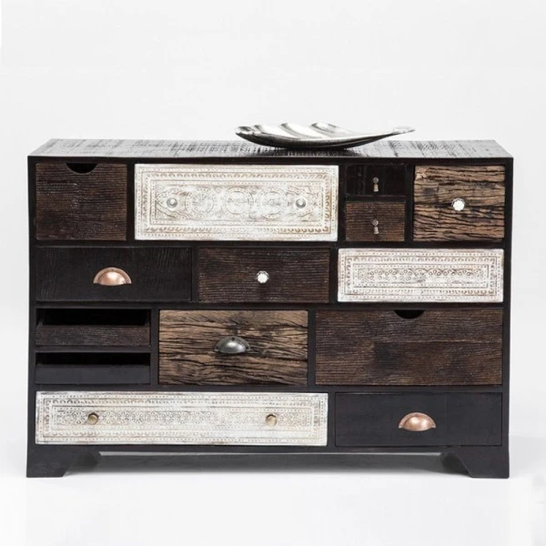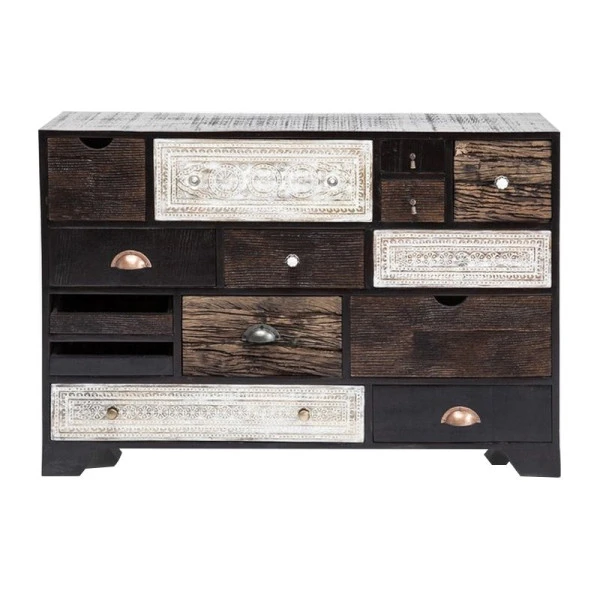 Met het dressoir Kare Design Finca 14D haal je een sfeervol meubel vol karakter in huis. Een aantal van de 14 lades zijn voorzien van uniek houtsnijwerk -met de hand vervaardigd-, en ook de andere lades mogen er zijn! Het design dressoir heeft een breedte van 114 centimeter en past mooi in uiteenlopende woonstijlen; van authentiek tot modern of retro.