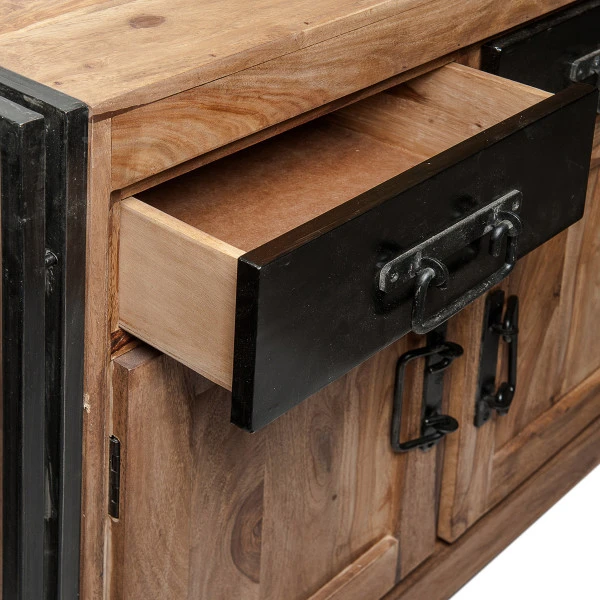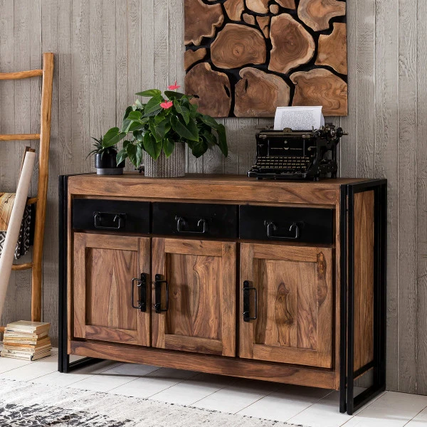 Als je van stijlvolle contrasten houdt zit je goed met dit dressoir van sheeshamhout en metaal. De golvende lijnen van de natuur springen naar voren in de houten deuren, omhuld door donkere contouren van zwart metaal. Het strakke design krijgt een charmant karakter dankzij de slanke poten en handgrepen. Op dit dressoir raak je niet snel uitgekeken!