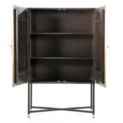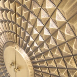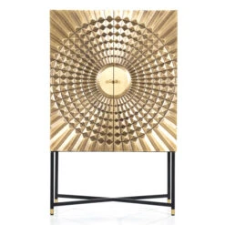 De Eleonora Noa kast is in staat een saaie woonkamer compleet te transformeren. De gouden deuren met reliëf patroon zijn het zonnetje in huis! Slanke, hoge poten geven de kast een ruimtelijk design. Berg er spelletjes in op of zet de gouden kast in de eetkamer en gebruik voor serviesgoed. In de drie ruime vakken achter de deuren kun je heel wat spullen opbergen.