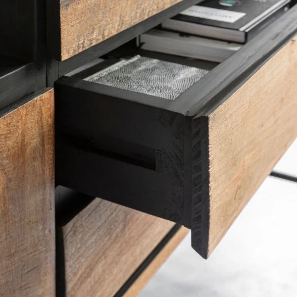 - Voorzien van drie deuren, drie lades en een open vak met mat zwarte binnenzijde