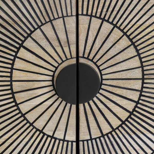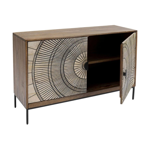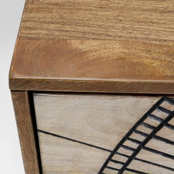 Dit Kare Design Eye of Tiger dressoir is voorzien van een prachtig patroon in de houten deuren. De lijnen zijn met de hand ingezaagd en beschilderd, zodat elke dressoir een eigen karakter heeft! Een ombouw van gelakt, massief mangohout draagt bij aan de sfeervolle uitstraling van het design dressoir.
