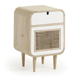 Met dit Kave Home Georg nachtkastje van 40×60 centimeter naast het bed krijgt je slaapkamer een gezellige uitstraling. Het mango houten frame zorgt voor sfeer, maar heeft dankzij de strakke lijnen en afgeronde hoeken ook een rustig effect op je slaapomgeving. Berg crèmes, oordopjes en je telefoon netjes weg in de lade van het nachtkastje; voor een leesboek en tijdschriften is plaats achter de rieten deur.