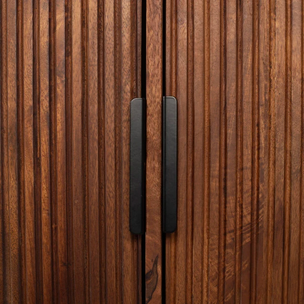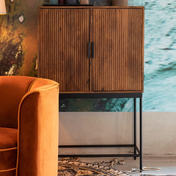 Kenmerkend voor de Dutchbone Saroo serie zijn de mangohouten deuren met ribbels. Een slank onderstel van metaal geeft de kasten een design uitstraling! Behalve deze compacte kast op hoge poten vind je in de serie ook een grotere wandkast en een bijpassend tv-meubel.