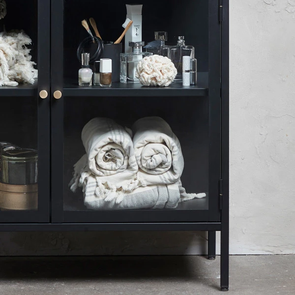 Combineer het metalen kastje met een bijpassende vitrinekast met 2 glazen deuren. Of wat denk je van een tv-meubel in dezelfde stijl? Je vindt ze allemaal in de Rise serie van Bodio: metalen meubels met glazen deuren en een gouden handgreep.