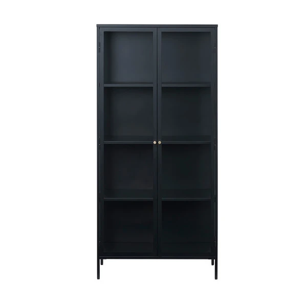 In deze metalen vitrinekast komen je boeken, souvenirs en servies prachtig tot recht. Het zwarte metaal vormt een mooi contrast met elke andere kleur. Bovendien staan je spulletjes stofvrij achter de glazen deuren. De vitrinekast heeft een breedte van 90 centimeter en past mooi in een modern- industrieel interieur. Ideaal voor je beste borden en glazen in de eetkamer! Of zet je de vitrinekast liever in de woonkamer?