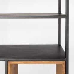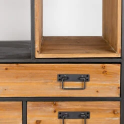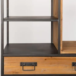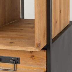 Net als deze open wandkast heeft de bijpassende lage ladekast uit de Samuel serie van Bodio een industriële look. Het massief sparrenhout geeft een natuurlijke en gezellige uitstraling, terwijl het frame en de handvatten van grijs ijzer voor een stoer accent zorgen.