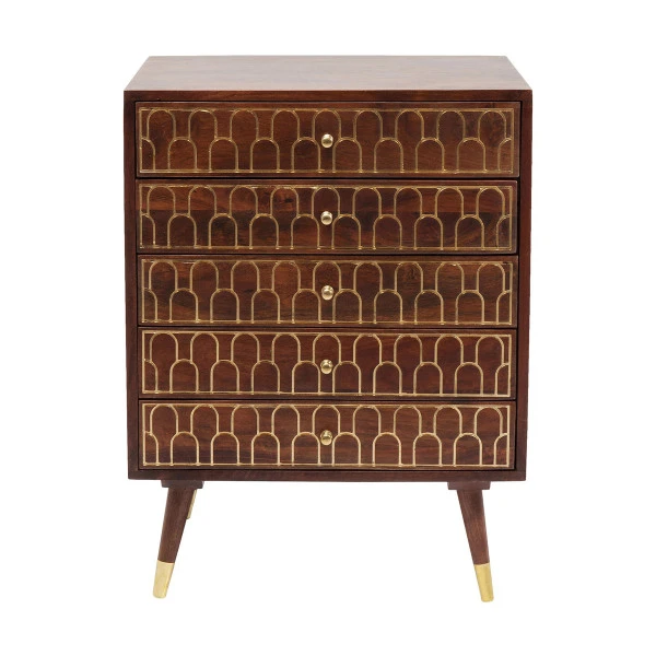 Dit elegante meubel is een knipoog naar de 60s, geheel in de stijl van nu. Gemaakt van massief mangohout en voorzien van goudkleurige accenten is deze ladenkast een echte eye-catcher. Met maar liefst vijf grote lades met elk een binnenmaat van 53 x 32 cm, voldoet het meubel ook aan functionele eisen. De warme tinten van het gelakte mangohout maken deze ladenkast een bijzonder welkome aanwinst in uw interieur.