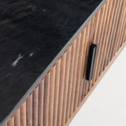 Met dit Eleonora Carter tv-meubel van 180 cm breed ziet je zithoek er voortaan gezellig opgeruimd uit. Want behalve een basis voor je televisiescherm en apparatuur biedt dit tv-meubel ook nog opbergruimte voor rommel! Het mangohout is geolied voor een prachtig sfeereffect. Bovenop het tv-meubel pronkt bovendien een blad van zwart marmer: voor een uniek, retro geheel.