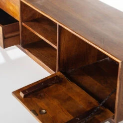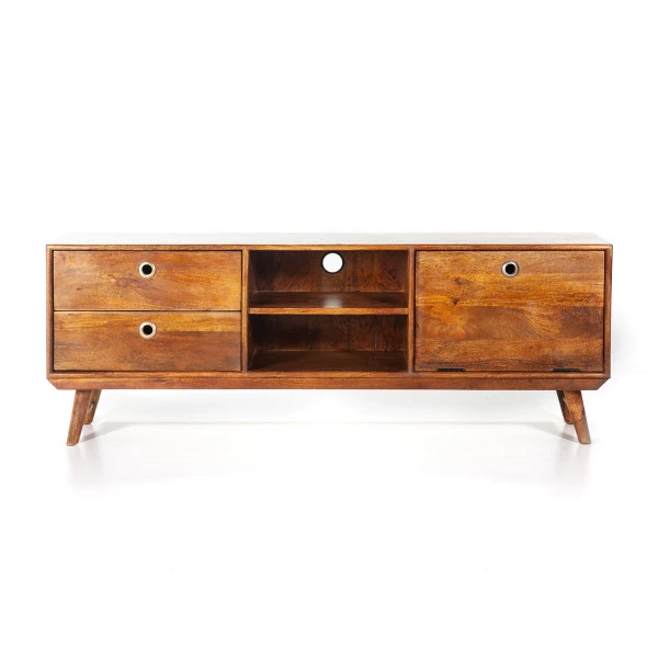 Met dit Eleonora Wisconsin tv-meubel van mangohout haal je een retro sfeertje in huis! Dat komt deels door het gelakt mangohout, dat een warme en diepe bruintint heeft. Maar ook de schuine, ronde poten dragen bij aan de jaren ’50 look. Je hebt keuze uit twee formaten tv-meubel: van 150 of 180 centimeter. In de open vakken is plaats voor apparatuur, en dan heb je nog veel opbergruimte over voor rommeltjes!