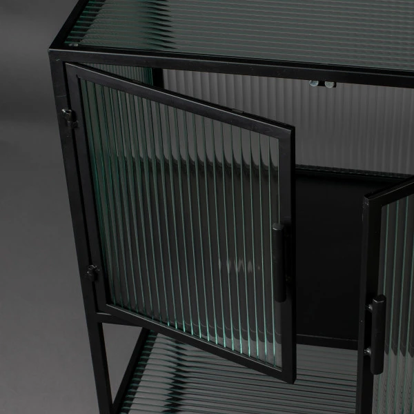 Je herkent de Dutchbone Boli serie aan de mix van zwart metaal en ribbelglas. Behalve deze compacte vitrinekast vind je in de serie ook een hoge wandkast, een ribbelglas dressoir en een klein wandkastje. Of zoek je nog een bijpassende salontafel?