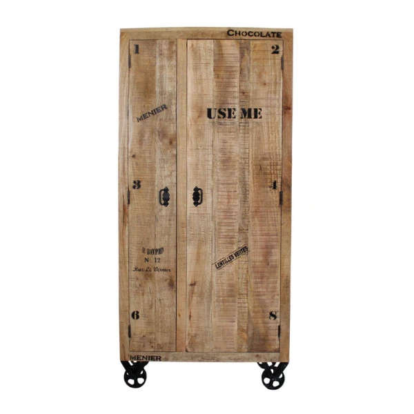 Met deze hoge wandkast op wielen creëer je een industriële look in huis! Speelse teksten zorgen voor een vintage accent, terwijl het mangohout veel sfeer brengt. Achter de deuren vind je 5 compartimenten in verschillende vormen en maten, zodat je de hoge wandkast voor allerlei spulletjes kunt gebruiken. In het grootste vak zit zelfs een roede verstopt: handig voor jassen of andere kleding!