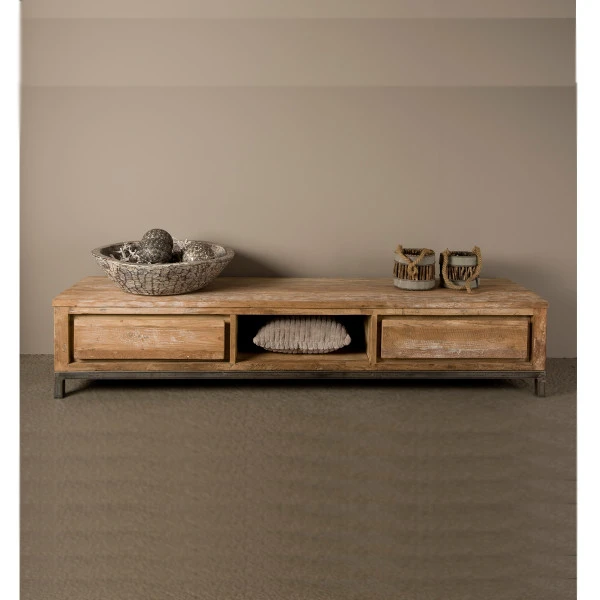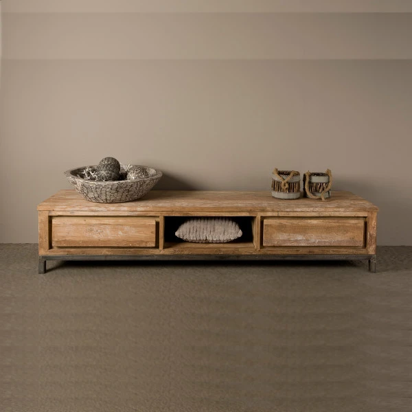Een houten tv- meubel met een stoere, industriële look: voor een stijlvol contrast met je moderne televisieapparatuur! Het kastje van 180 cm breed staat stevig op een metalen onderstel dat mooi samengaat met het robuust afgewerkte teakhout. Elk exemplaar is uniek, met subtiele variaties in de kleuren en lijnen van het hout.