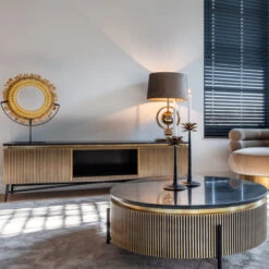 Wat de meubels uit de Richmond Interiors Ironville serie bijzonder maakt zijn de luxe materialen. Hout bekleed met metaalplaat zorgt voor een messing gloed; een blad van echt marmer maakt de stijl compleet. Combineer het tv-meubel met een bijpassende salontafel of een wandkast met messing ribbelmotief!