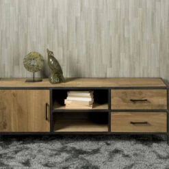 Dit TemaHome Nina tv-meubel combineert design met sfeer. Eiken planken zorgen voor een natuurlijke uitstraling, terwijl de strakke lijnen echt een moderne look geven! Maar het zijn de V-poten die het tv-meubel zo elegant maken. Zet apparatuur en boeken of decoraties in de open vakken; dankzij de schuifdeur kun je elk moment bepalen wat in zicht is. Welk dressoir past het beste in jouw interieur: zwart of wit?