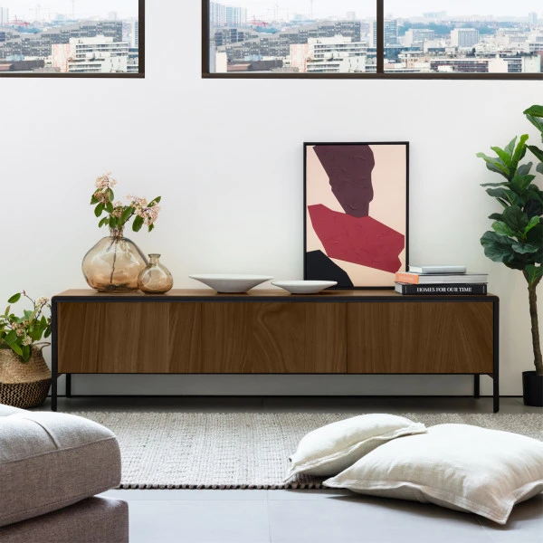 Op het Kave Home Nadyria tv-meubel van 180 centimeter breed kun je een flink beeldscherm zetten. Of hang het erboven en gebruik het dressoir voor subtiele, gezellige decoraties. Het tv-meubel heeft een retro design met moderne elementen. Daarbij heb je keuze uit 2 kleuren: walnoot of eiken. Achter de push-to-open deuren vind je drie ruime vakken om allerlei rommeltjes, serviesgoed of spelletjes in op te bergen!