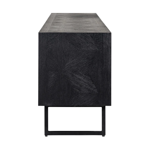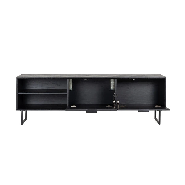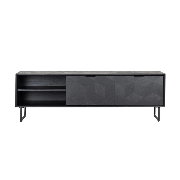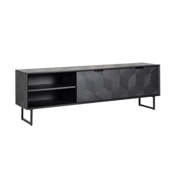 Het Richmond Interiors Blax tv-meubel vormt een prachtig geheel met je televisiescherm en apparatuur. Het zwart hout is voorzien van een subtiel patroon dat het tv-meubel een eigentijds karakter geeft! Met een breedte van 180 centimeter kun je in dit tv-meubel ook nog veel spullen kwijt. Zet apparatuur in de open vakken en berg wijnglazen, boeken en spelletjes netjes op achter de deuren.