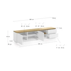 In dit Kave Home Abilen tv-meubel van 200 cm breed kun je alle rommeltjes kwijt die anders altijd je zithoek zo ongezellig maakten! Berg er wijnglazen in op en het speelgoed van de kinderen; televisieapparatuur natuurlijk, en stapels vol tijdschriften. Zo brengt het tv-meubel veel rust naar je zithoek. Ook vanwege het strakke design met lichte kleuren: gelakt wit en naturel eiken.
