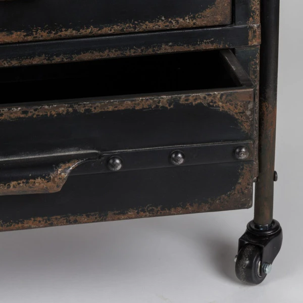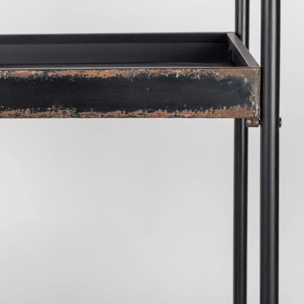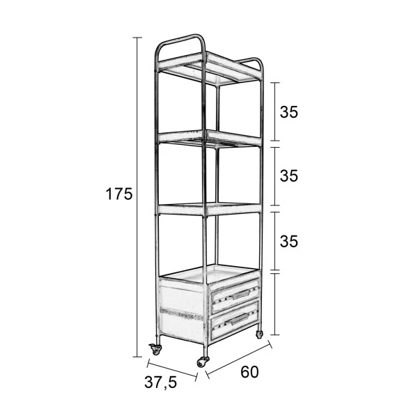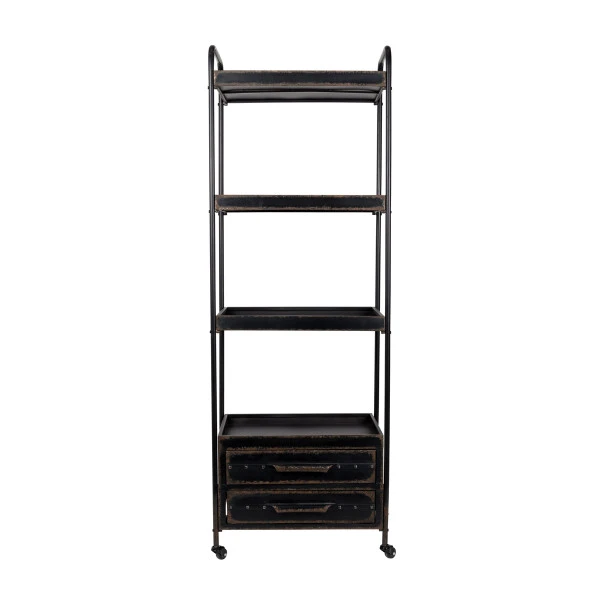 Een verrijdbaar metalen rek dat een vintage look naar je interieur brengt: daar zorgt de subtiele roestafwerking wel voor. Het rek is met 175 centimeter hoog te noemen en biedt zo veel plaats aan decoraties, boeken, serviesgoed of plantjes! Die kun je allemaal kwijt op 4 ruime planken, terwijl in de 2 lades plaats is voor losse rommeltjes om je woonkamer netjes opgeruimd te houden.