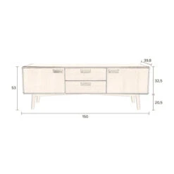 In dit Dutchbone Juju tv-meubel van 150 centimeter breed is veel plaats voor je apparatuur én de losse rommeltjes die anders altijd de woonkamer zo ongezellig maken. Wil je een sfeervol, harmonieus geheel creëren in je interieur? Dan kun je het tv-meubel combineren met het bruin houten dressoir uit dezelfde Juju serie!
