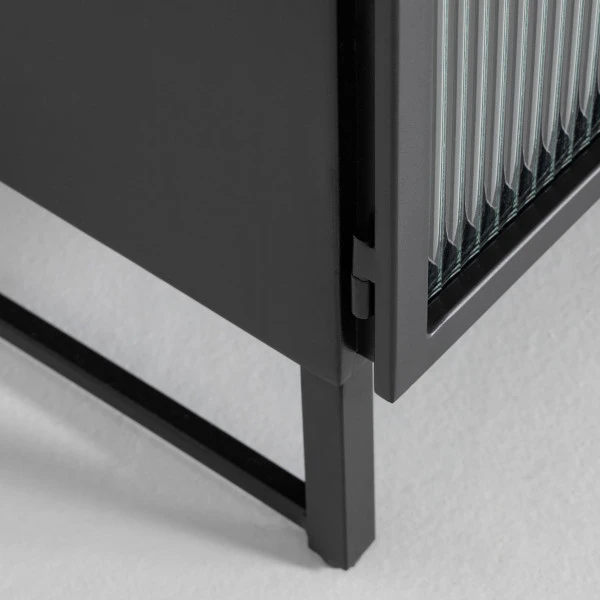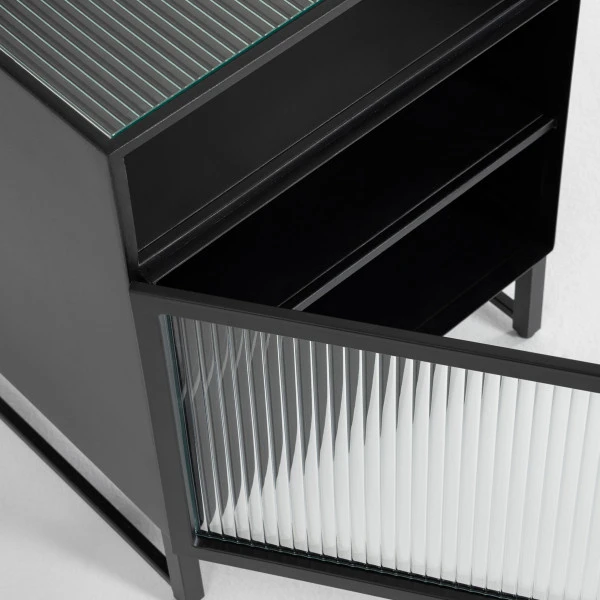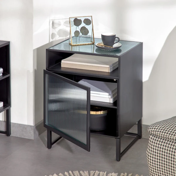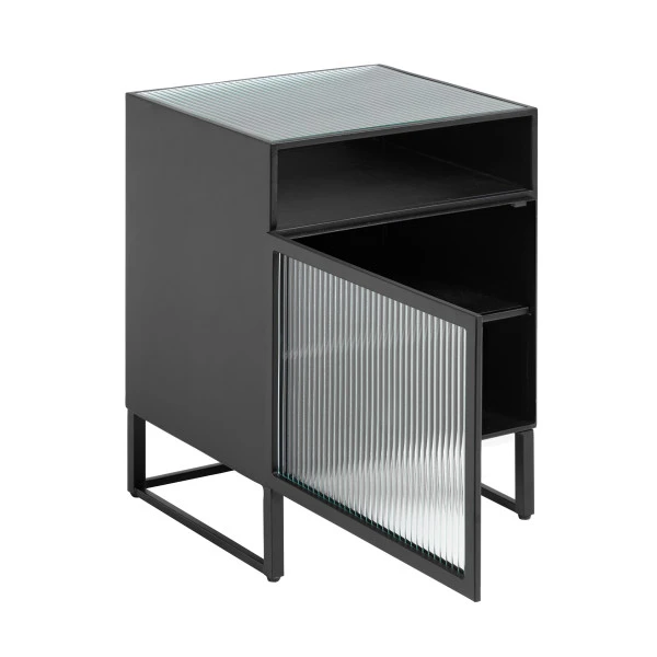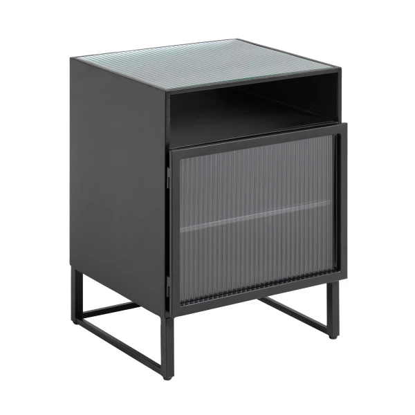 Dit Kave Home Trixie nachtkastje biedt zoveel opbergruimte dat je voortaan in een heerlijk nette slaapkamer slaapt. Stop boeken en tijdschriften weg achter de deur van ribbelglas en geef nachtcrèmes en oordopjes een vaste plek in het open vak. Natuurlijk kun je dit nachtkastje van zwart metaal en ribbelglas ook heel goed in de woonkamer gebruiken, als kastje voor boeken of wijnglazen!