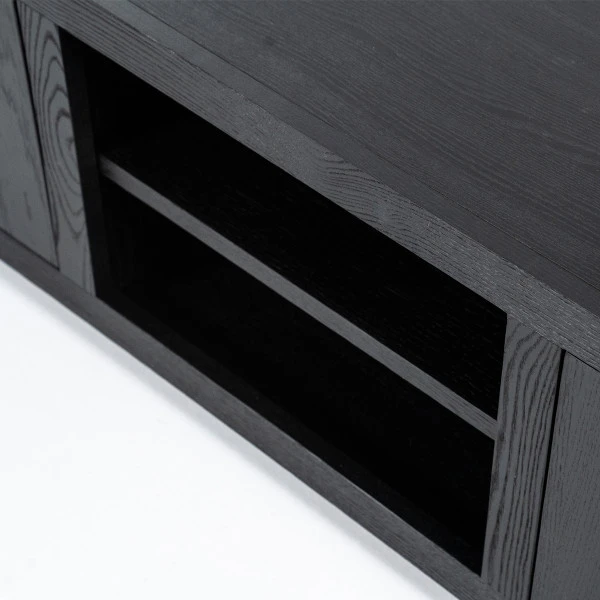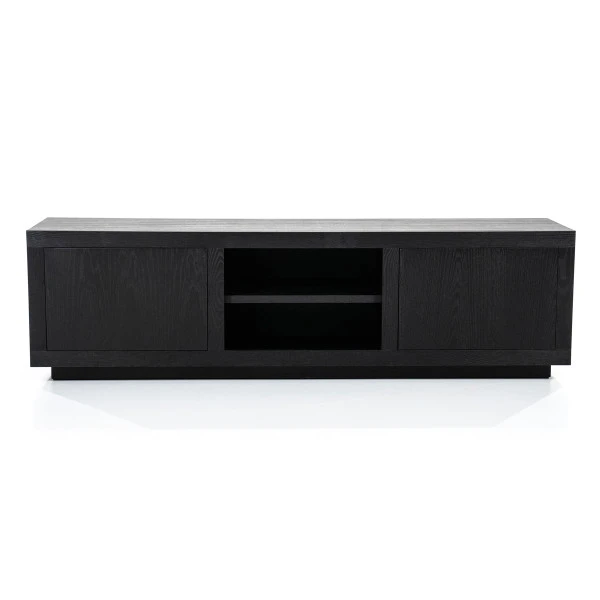 Het Eleonora Helsinki tv-meubel van 160 cm breed brengt rust naar je zithoek. Het strakke, minimalistische design zorgt daarvoor; maar ook de opbergruimte in het tv-meubel! Ruim rommeltjes netjes weg achter de deuren van zwart eiken hout, en zet apparatuur of decoraties in de open vakken. De deuren werken met een fijn push-to-open systeem.