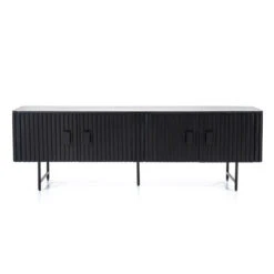 Dit Eleonora Remi tv-meubel staat speels op slanke poten, maar het zijn de houten latjes die echt voor een retro look zorgen. Ook de ronde hoeken dragen bij aan de retro stijl. Je beeldscherm komt mooi tot recht op of boven dit tv-meubel van zwart mangohout! Achter de deuren is plaats voor apparatuur, spelletjes en wijnglazen.
