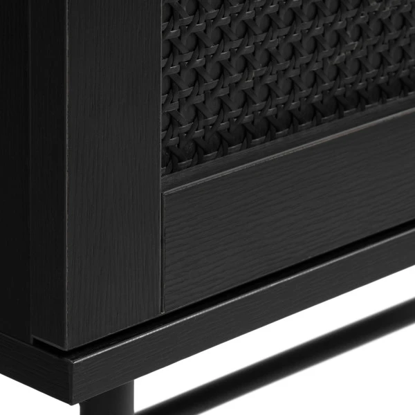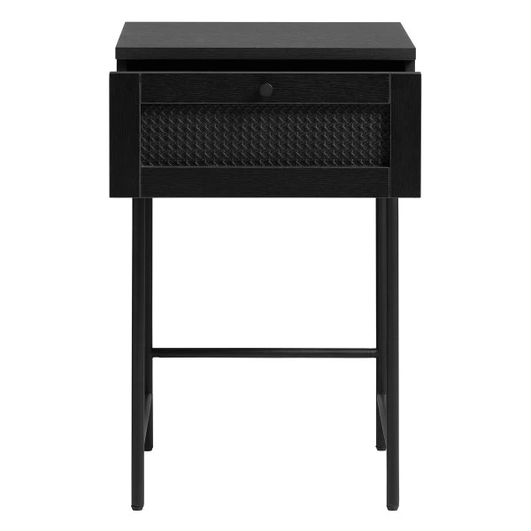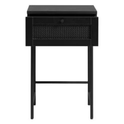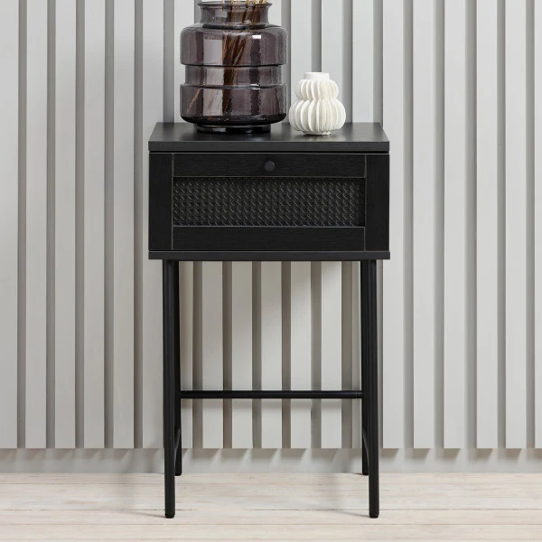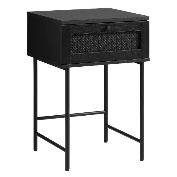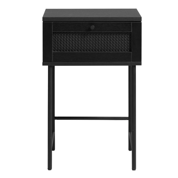 - Nachtkastje is gemaakt van zwarte melamine met rotan